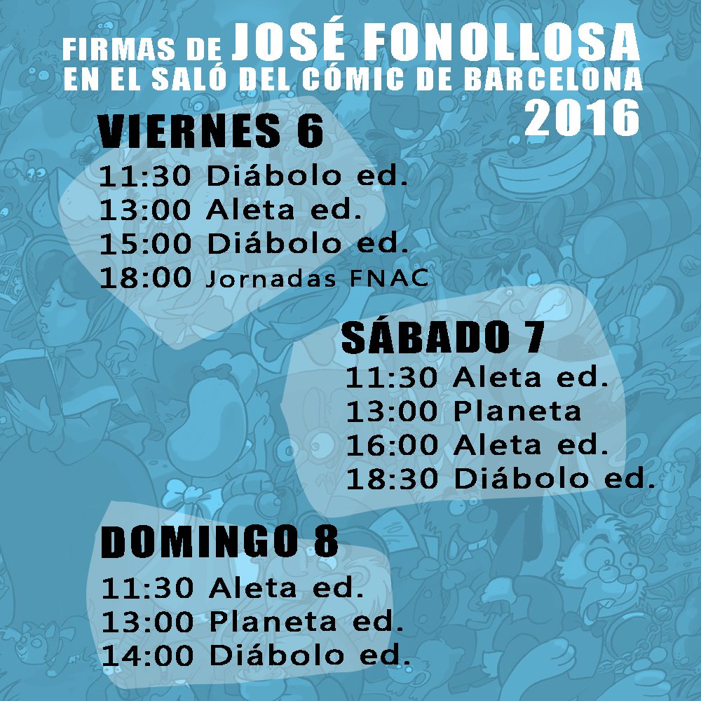 - Aleta Ediciones: Viernes 6 a las 13h y a las 17h // Sábado 7 a las 11:30h y a las 16h // Domingo 8 a las 11:30h